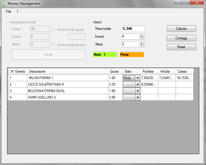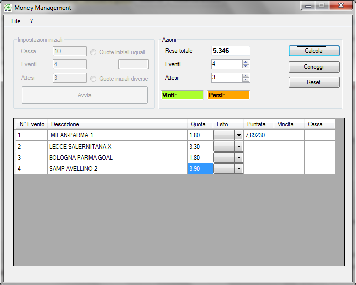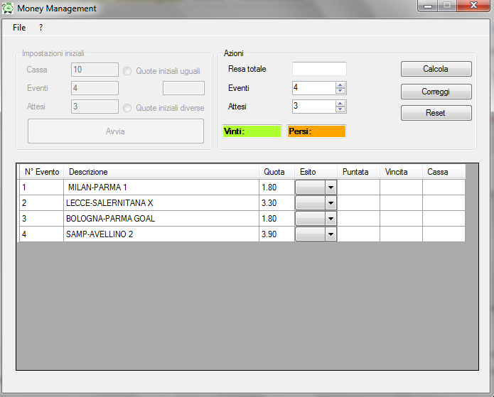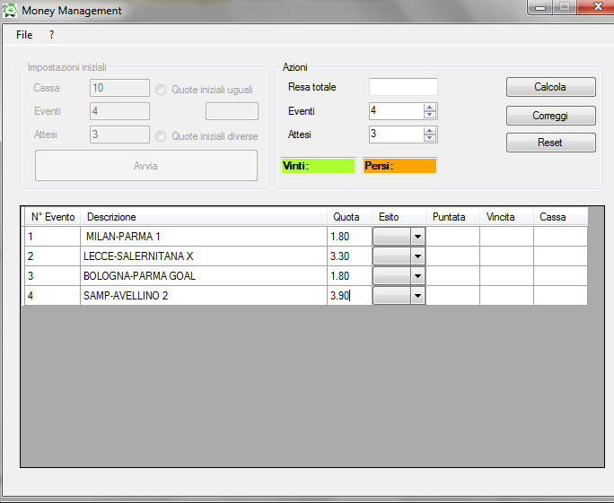 Dopo aver cliccato sul tasto “Avvia”, il software permette di inserire i match individuati. Supponiamo di avere scelto le seguenti ipotetiche gare: