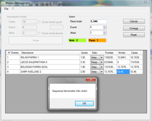 Dopo la conclusione della prima gara, dal menù a tendina dobbiamo scegliere il risultato (vinta o persa). In base all’esito il sistema calcola la quota da puntare sul secondo match della serie scelta: