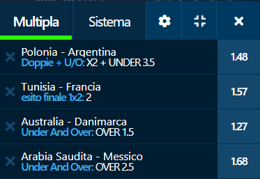Combo per Polonia-Argentina con i sudamericani favoriti per la vittoria di questo match tuttavia in una multipla meglio andare sulla doppia chance per un esito già analizzato e motivato nell'analisi completa presente sul sito. Messi è carico dopo 2 gol in altrettanti match e vuole assolutamente proseguire il cammino in questo mondiale che potrebbe essere l'ultimo per lui.