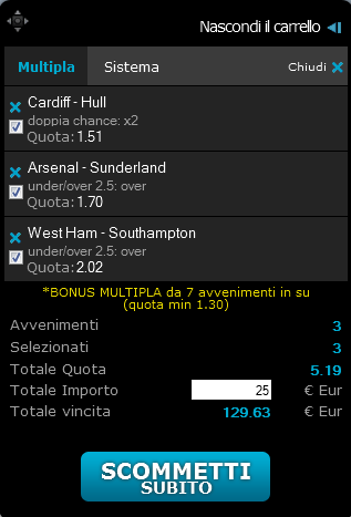Vi ricordo che potete approfittare dello splendido BONUS del 100% di BetFlag sul primo versamento fino a 25 € (versamento minimo 10 €) In pratica se versate 25€ e appena verificate il conto vi accrediteranno altri 25 €.
