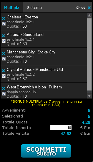 Per giocare i nostri pronostici basta cliccare sulla bolla, verrete indirizzati su BetFlag e nel carrello troverete già la bolla compilata così com’è sul sito con i miei pronostici. Non dovrete fare altro che fare il login se siete già registrati, oppure registrarvi, inserire l’importo che volete scommettere ed è tutto fatto.