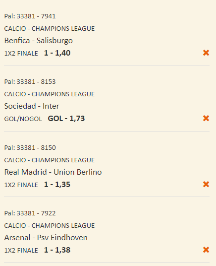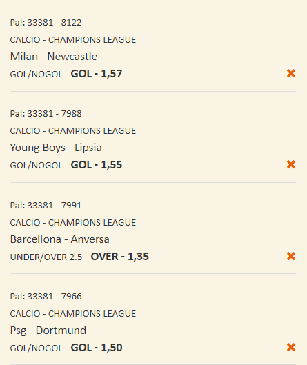Schedine Champions League 19 e 20-09-23 Recensione Bonus Il nostro Voto Offerta SNAI € 5+500 4.8 Scopri Pronostici Champions League 2023-09-19 Scommetti 25 € VINCI 123 € PIAZZA LA SCOMMESSA Quota Totale 4.92 SNAI ti offre subito 5€ GRATIS senza deposito, più 10 GRATIS al Casinò e 550 € di rimborso scommesse Scommetti 25 € VINCI 112.75 € PIAZZA LA SCOMMESSA Quota Totale 4.51 SNAI ti offre subito 5€ GRATIS senza deposito, più 10 GRATIS al Casinò e 550 € di rimborso scommesse Book Consigliati e Recensiti 1 15 € GRATIS + 1024 € 4.8 / 5 TOTAL SCORE Check >>> Check >>> 2 30 euro + 20 giocate gratis 3.9 / 5 TOTAL SCORE Check >>> Check >>> 3 5 € GRATIS + 300 4.6 / 5 TOTAL SCORE Check >>> Check >>> 4 100 € sulla prima scommessa 4.8 / 5 TOTAL SCORE Check >>> Check >>>