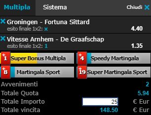Apriamo la seconda giocata con la partita Groningen - Fortuna Sittard: squadra di casa che durante il corso della stagione ha avuto alti e bassi, facendo un buonissimo recupero in questa parte finale. Ma le recenti due sconfitte consecutive, sembrano chiudere definitivamente la porta per l'ingresso in zona gialla. Gli ospiti cercano punti per ufficializzare la salvezza. X a quota 4.40.