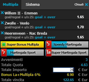 Seconda partita della prima giocata è Zwolle - Venlo: abbiamo di fronte due squadre che in virtù dei loro trentotto punti, non hanno più niente da chiedere al campionato. Ci si aspettava un pò di più dalla squadra di casa ad inizio stagione (almeno sulla carta) doveva piazzarsi almeno al settimo posto play- off. Bene gli ospiti con la salvezza conquistata in anticipo. GG + Ov2,5 a quota 1.70.