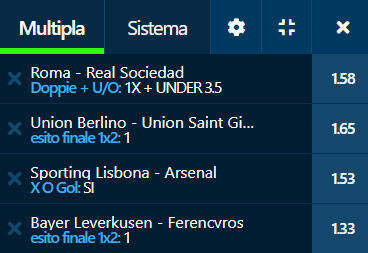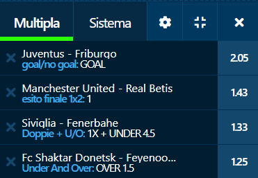 Schedine Europa League 09-03-23 Pronostici Europa League 2023-03-09 Quota Media sui Book Recensiti 5.30 Quota Media sui Book Recensiti 4.87 Book Consigliati e Recensiti 1 15 € GRATIS + 1024 € 4.8 / 5 TOTAL SCORE Check >>> Check >>> 2 30 euro + 20 giocate gratis 3.9 / 5 TOTAL SCORE Check >>> Check >>> 3 5 € GRATIS + 300 4.6 / 5 TOTAL SCORE Check >>> Check >>> 4 100 € sulla prima scommessa 4.8 / 5 TOTAL SCORE Check >>> Check >>>