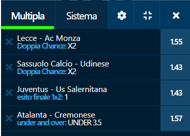 Schedine Serie A 11-09-22 Pronostici Serie a 2022-09-11 Quota Media sui Book Recensiti 4.80 Quota Media sui Book Recensiti 4.98 Book Consigliati e Recensiti 1 15 € GRATIS + 1024 € 4.8 / 5 TOTAL SCORE Check >>> Check >>> 2 30 euro + 20 giocate gratis 3.9 / 5 TOTAL SCORE Check >>> Check >>> 3 5 € GRATIS + 300 4.6 / 5 TOTAL SCORE Check >>> Check >>> 4 100 € sulla prima scommessa 4.8 / 5 TOTAL SCORE Check >>> Check >>>