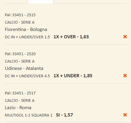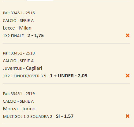 Schedine Serie A 11 e 12-11-23 Recensione Bonus Il nostro Voto Offerta SNAI € 5+500 4.8 Scopri Pronostici Serie a 2023-11-12 Scommetti 25 € VINCI 140.75 € PIAZZA LA SCOMMESSA Quota Totale 5.63 SNAI ti offre subito 5€ GRATIS senza deposito, più 10 GRATIS al Casinò e 550 € di rimborso scommesse Scommetti 25 € VINCI 118.25 € PIAZZA LA SCOMMESSA Quota Totale 4.73 SNAI ti offre subito 5€ GRATIS senza deposito, più 10 GRATIS al Casinò e 550 € di rimborso scommesse Book Consigliati e Recensiti 1 15 € GRATIS + 1024 € 4.8 / 5 TOTAL SCORE Check >>> Check >>> 2 30 euro + 20 giocate gratis 3.9 / 5 TOTAL SCORE Check >>> Check >>> 3 5 € GRATIS + 300 4.6 / 5 TOTAL SCORE Check >>> Check >>> 4 100 € sulla prima scommessa 4.8 / 5 TOTAL SCORE Check >>> Check >>>