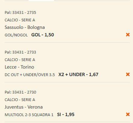 Schedine Serie A 28 e 29-10-23 Recensione Bonus Il nostro Voto Offerta SNAI € 5+500 4.8 Scopri Pronostici Serie a 2023-10-28 Scommetti 25 € VINCI 122 € PIAZZA LA SCOMMESSA Quota Totale 4.88 SNAI ti offre subito 5€ GRATIS senza deposito, più 10 GRATIS al Casinò e 550 € di rimborso scommesse Book Consigliati e Recensiti 1 15 € GRATIS + 1024 € 4.8 / 5 TOTAL SCORE Check >>> Check >>> 2 30 euro + 20 giocate gratis 3.9 / 5 TOTAL SCORE Check >>> Check >>> 3 5 € GRATIS + 300 4.6 / 5 TOTAL SCORE Check >>> Check >>> 4 100 € sulla prima scommessa 4.8 / 5 TOTAL SCORE Check >>> Check >>>