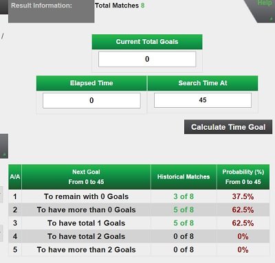 Inserendo come variabili 0 a current goal, elapsed time 0 (inizio partita) e Search time at 45° (fine primo tempo) si trova che nelle precedenti stagioni la partita non è mai finita nel primo tempo con più di un goal segnato da entrambe le squadre. Nel 37.8% dei casi il primo tempo è finito 0-0 e nel restante 62.5% è finita con un goal di scarto. Con questa informazione di poteva puntare under 1.5 primo tempo (così come si è fatto) intorno a quota 1.40, oppure fare scalping in tempo reale sul betting exchange. La partita è finita 0-0 !