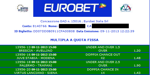 Vi pubblico la ricevuta della bolletta vincente sulla serie b giocata con ipronostici del 09-11-2013