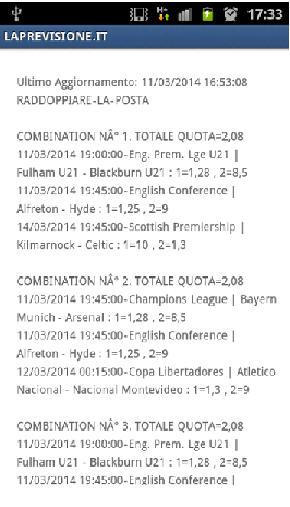Con la App “LaPrevisione.IT” l’utente ha sempre a disposizione un utile strumento per conoscere ed essere informato in tempo reale sull’andamento delle quote di tutte le partite del mondo. La App offre due specifiche schermate