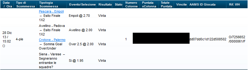 perdonami ma il 2 secco del lanciano lo scopro ora ! un x2 l hai giocato in una bolla da4 purtroppo perdendo e l 1 del carpi anche mi e nuovo mi risulta che hai vinto con altre 2 bolle .grande lo stesso ma correggimi se sbaglio un augurio di buon fine anno ,aspetto risposta