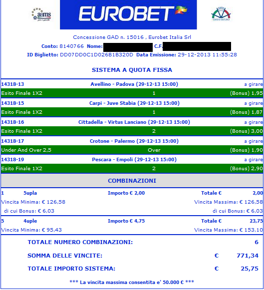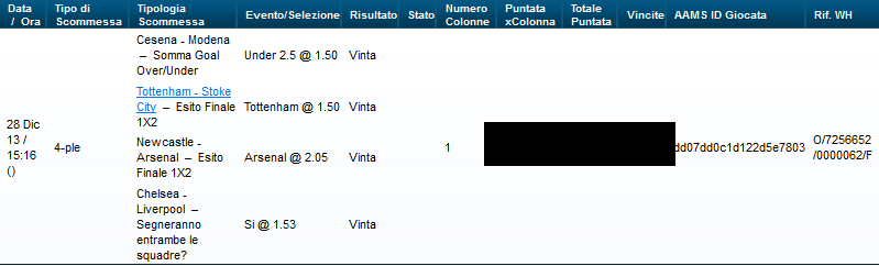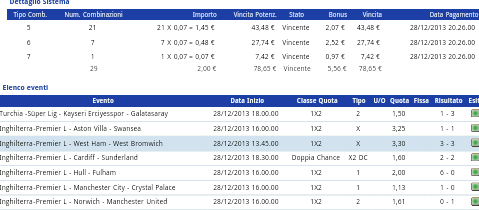 Che Domenica ragazzi !!!! Due bolle presenti nei pronostici del giorno chiuse, un sistema da 770 € beccato in pieno con 5 eventi su 5 e molti di voi che hanno vinto bei soldini specialmente con la seconda bolla a quota 21. Voglio ringraziare pubblicamente tutti coloro che mi hanno offerto una birra con una piccola donazione come segno di riconoscenza per le vincite fatte.(Chi ne avesse voglia e no sà come fare può sfruttare il widget in basso a sinistra “Offrimi una birra”).Inoltre mi hanno fatto piacere le numerose mail che ho ricevuto in cui molti di voi mi raccontano la propria storia di giocatori e delle scommesse che fanno e mi esprimono la loro riconoscenza per le numerose vincite che laprevisione.it gli ha permesso di fare. Ci voleva proprio una giornata così, In primo luogo per chiudere bene l’anno e come augurio per l’anno venturo. Poi permettetemi di togliermi qualche sassolino dalle scarpe, dopo averlo fatto nei commenti ( leggete i commenti a questo articolo) voglio farlo anche qui, voglio rispondere a chi,dopo una giornata negativa dice insultandomi,che non ne becchiamo una e che sono un millantatore ed un lestofante….. SONO I FATTI E LE VINCITE CHE PARLANO. laprevisione.it lo ripeto ed è una cosa a cui tengo molto, è l’unico blog/sito che pubblica le ricevute delle scommesse che propone questo a dimostrare che non cambiamo i pronostici dopo le partite e che giochiamo quello che proponiamo agli altri. Tutto questo, però non ci deve far dimenticare che tutto questo è solo un gioco e che non bisogna scommettere cifre che non si possono perdere.