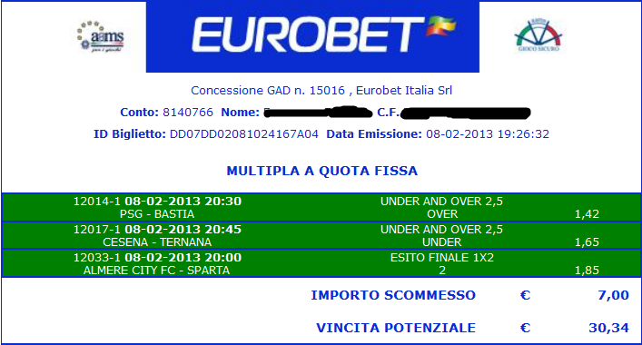Ieri en-plein!!!!!! Entrambi le scommesse proposte nell’articolo dei pronostici del giorno sono risultate vincenti e come al solito vi pubblico le ricevute. E sono quattro le bollette chiuse in questa settimana, speriamo di continuare così