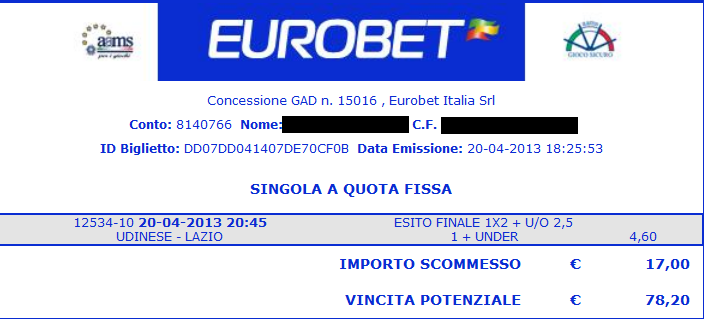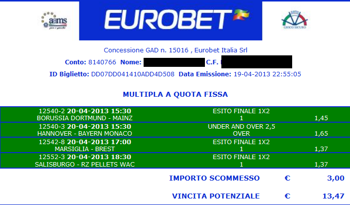 Vi pubblico le ricevute delle tre scommesse vincenti giocate con i pronostici del 20 aprile .