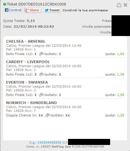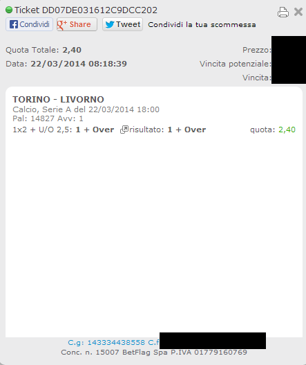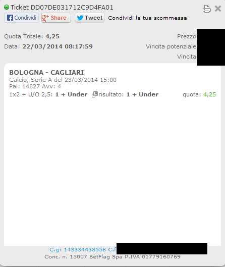 E questa è la ricevuta della multipla, in cui manca solo Napoli-Fiorentina e che comunque ci verrà rimborsata da BetFlag avendo perso un solo avvenimento.
