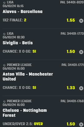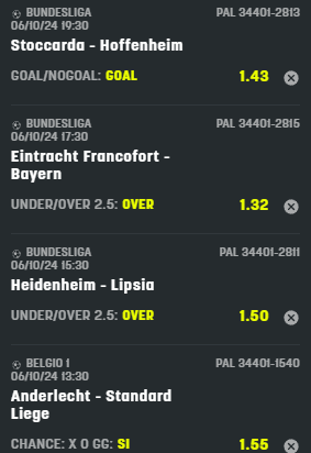 Pronostici calcio 06-10-24 Le scommesse della domenica Recensione Bonus Il nostro Voto Offerta SNAI € 5+500 4.8 Scopri Pronostici di oggi 2024-10-06 Scommetti 25 € VINCI 115.75 € PIAZZA LA SCOMMESSA Quota Totale 4.63 SNAI ti offre subito 5€ GRATIS senza deposito, più 10 GRATIS al Casinò e 550 € di rimborso scommesse Scommetti 25 € VINCI 109.5 € PIAZZA LA SCOMMESSA Quota Totale 4.38 SNAI ti offre subito 5€ GRATIS senza deposito, più 10 GRATIS al Casinò e 550 € di rimborso scommesse Book Consigliati e Recensiti 1 15 € GRATIS + 1024 € 4.8 / 5 TOTAL SCORE Check >>> Check >>> 2 30 euro + 20 giocate gratis 3.9 / 5 TOTAL SCORE Check >>> Check >>> 3 5 € GRATIS + 300 4.6 / 5 TOTAL SCORE Check >>> Check >>> 4 100 € sulla prima scommessa 4.8 / 5 TOTAL SCORE Check >>> Check >>>