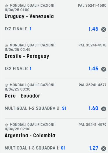 Pronostici calcio 11-06-25 Recensione Bonus Il nostro Voto Offerta SNAI € 5+500 4.8 Scopri Pronostici di oggi 2025-06-10 Scommetti 25 € VINCI 106.75 € PIAZZA LA SCOMMESSA Quota Totale 4.27 SNAI ti offre subito 5€ GRATIS senza deposito, più 10 GRATIS al Casinò e 550 € di rimborso scommesse Book Consigliati e Recensiti 1 15 € GRATIS + 1024 € 4.8 / 5 TOTAL SCORE Check >>> Check >>> 2 30 euro + 20 giocate gratis 3.9 / 5 TOTAL SCORE Check >>> Check >>> 3 5 € GRATIS + 300 4.6 / 5 TOTAL SCORE Check >>> Check >>> 4 100 € sulla prima scommessa 4.8 / 5 TOTAL SCORE Check >>> Check >>>