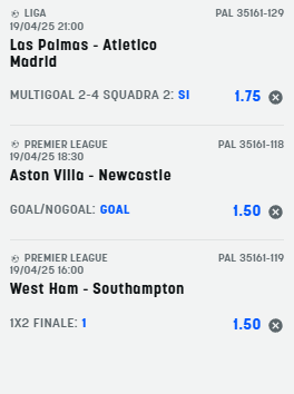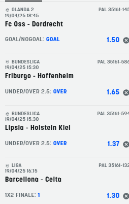 Pronostici calcio 19-04-25 Le scommesse del sabato Recensione Bonus Il nostro Voto Offerta SNAI € 5+500 4.8 Scopri Pronostici di oggi 2025-04-19 Scommetti 25 € VINCI 110 € PIAZZA LA SCOMMESSA Quota Totale 4.40 SNAI ti offre subito 5€ GRATIS senza deposito, più 10 GRATIS al Casinò e 550 € di rimborso scommesse Scommetti 25 € VINCI 98.25 € PIAZZA LA SCOMMESSA Quota Totale 3.93 SNAI ti offre subito 5€ GRATIS senza deposito, più 10 GRATIS al Casinò e 550 € di rimborso scommesse Book Consigliati e Recensiti 1 15 € GRATIS + 1024 € 4.8 / 5 TOTAL SCORE Check >>> Check >>> 2 30 euro + 20 giocate gratis 3.9 / 5 TOTAL SCORE Check >>> Check >>> 3 5 € GRATIS + 300 4.6 / 5 TOTAL SCORE Check >>> Check >>> 4 100 € sulla prima scommessa 4.8 / 5 TOTAL SCORE Check >>> Check >>>