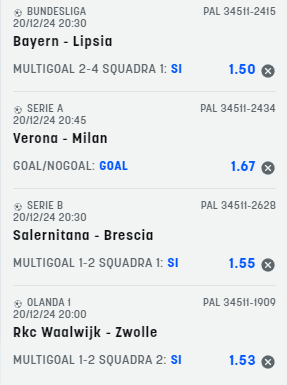 Pronostici calcio 20-12-24 Recensione Bonus Il nostro Voto Offerta SNAI € 5+500 4.8 Scopri Pronostici di oggi 2024-12-20 Scommetti 25 € VINCI 148.5 € PIAZZA LA SCOMMESSA Quota Totale 5.94 SNAI ti offre subito 5€ GRATIS senza deposito, più 10 GRATIS al Casinò e 550 € di rimborso scommesse Scommetti 25 € VINCI 133 € PIAZZA LA SCOMMESSA Quota Totale 5.32 SNAI ti offre subito 5€ GRATIS senza deposito, più 10 GRATIS al Casinò e 550 € di rimborso scommesse Book Consigliati e Recensiti 1 15 € GRATIS + 1024 € 4.8 / 5 TOTAL SCORE Check >>> Check >>> 2 30 euro + 20 giocate gratis 3.9 / 5 TOTAL SCORE Check >>> Check >>> 3 5 € GRATIS + 300 4.6 / 5 TOTAL SCORE Check >>> Check >>> 4 100 € sulla prima scommessa 4.8 / 5 TOTAL SCORE Check >>> Check >>>