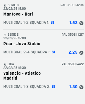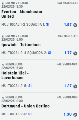 Pronostici calcio 22-02-25 Le scommesse del sabato Recensione Bonus Il nostro Voto Offerta SNAI € 5+500 4.8 Scopri Pronostici di oggi 2025-02-22 Scommetti 25 € VINCI 114.5 € PIAZZA LA SCOMMESSA Quota Totale 4.58 SNAI ti offre subito 5€ GRATIS senza deposito, più 10 GRATIS al Casinò e 550 € di rimborso scommesse Scommetti 25 € VINCI 111.75 € PIAZZA LA SCOMMESSA Quota Totale 4.47 SNAI ti offre subito 5€ GRATIS senza deposito, più 10 GRATIS al Casinò e 550 € di rimborso scommesse Book Consigliati e Recensiti 1 15 € GRATIS + 1024 € 4.8 / 5 TOTAL SCORE Check >>> Check >>> 2 30 euro + 20 giocate gratis 3.9 / 5 TOTAL SCORE Check >>> Check >>> 3 5 € GRATIS + 300 4.6 / 5 TOTAL SCORE Check >>> Check >>> 4 100 € sulla prima scommessa 4.8 / 5 TOTAL SCORE Check >>> Check >>>