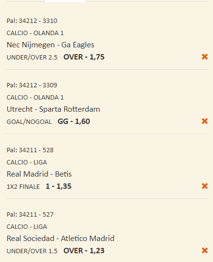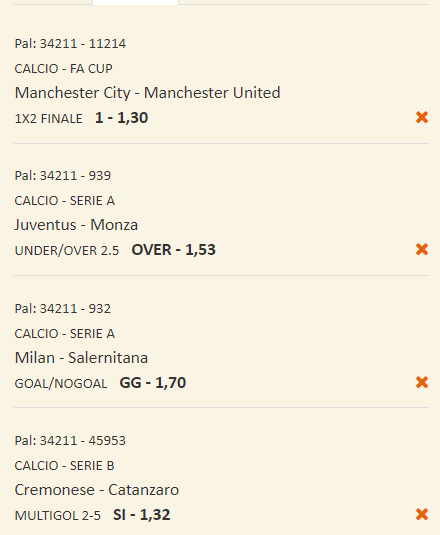 Pronostici calcio 25-05-24 Le scommesse del sabato Recensione Bonus Il nostro Voto Offerta SNAI € 5+500 4.8 Scopri Pronostici di oggi 2024-05-25 Scommetti 25 € VINCI 111.5 € PIAZZA LA SCOMMESSA Quota Totale 4.46 SNAI ti offre subito 5€ GRATIS senza deposito, più 10 GRATIS al Casinò e 550 € di rimborso scommesse Scommetti 25 € VINCI 116 € PIAZZA LA SCOMMESSA Quota Totale 4.64 SNAI ti offre subito 5€ GRATIS senza deposito, più 10 GRATIS al Casinò e 550 € di rimborso scommesse Book Consigliati e Recensiti 1 15 € GRATIS + 1024 € 4.8 / 5 TOTAL SCORE Check >>> Check >>> 2 30 euro + 20 giocate gratis 3.9 / 5 TOTAL SCORE Check >>> Check >>> 3 5 € GRATIS + 300 4.6 / 5 TOTAL SCORE Check >>> Check >>> 4 100 € sulla prima scommessa 4.8 / 5 TOTAL SCORE Check >>> Check >>>