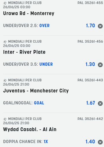 Pronostici calcio 26-06-25 Recensione Bonus Il nostro Voto Offerta SNAI € 5+500 4.8 Scopri Pronostici di oggi 2025-06-26 Scommetti 25 € VINCI 129 € PIAZZA LA SCOMMESSA Quota Totale 5.16 SNAI ti offre subito 5€ GRATIS senza deposito, più 10 GRATIS al Casinò e 550 € di rimborso scommesse Book Consigliati e Recensiti 1 15 € GRATIS + 1024 € 4.8 / 5 TOTAL SCORE Check >>> Check >>> 2 30 euro + 20 giocate gratis 3.9 / 5 TOTAL SCORE Check >>> Check >>> 3 5 € GRATIS + 300 4.6 / 5 TOTAL SCORE Check >>> Check >>> 4 100 € sulla prima scommessa 4.8 / 5 TOTAL SCORE Check >>> Check >>>