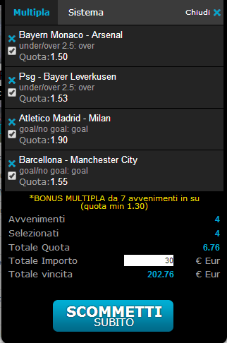 Pronostico Barcellona-Manchester City e Psg-Bayern Leverkusen