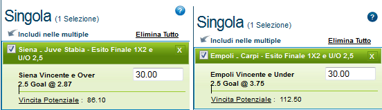 Altra squadra che secondo me tornerà alla vittoria è il Siena, che al netto della penalizzazione di 7 punti, sarebbe 4° in classifica. I toscani sono attrezzati almeno per disputarsi i play-off e partite come questa in casa, contro l’ultima in classifica sono occasioni da non perdere per raggiungere l’obbiettivo. Per questa partita giocheremo 1 e l’Ov2,5 in multipla e accoppiati in combobet.