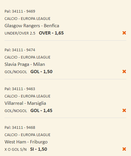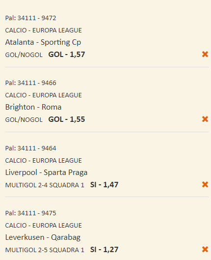 Schedina Europa League 14-03-24 Recensione Bonus Il nostro Voto Offerta SNAI € 5+500 4.8 Scopri Pronostici Europa League 2024-03-14 Scommetti 25 € VINCI 134.5 € PIAZZA LA SCOMMESSA Quota Totale 5.38 SNAI ti offre subito 5€ GRATIS senza deposito, più 10 GRATIS al Casinò e 550 € di rimborso scommesse Scommetti 25 € VINCI 113.5 € PIAZZA LA SCOMMESSA Quota Totale 4.54 SNAI ti offre subito 5€ GRATIS senza deposito, più 10 GRATIS al Casinò e 550 € di rimborso scommesse Book Consigliati e Recensiti 1 15 € GRATIS + 1024 € 4.8 / 5 TOTAL SCORE Check >>> Check >>> 2 30 euro + 20 giocate gratis 3.9 / 5 TOTAL SCORE Check >>> Check >>> 3 5 € GRATIS + 300 4.6 / 5 TOTAL SCORE Check >>> Check >>> 4 100 € sulla prima scommessa 4.8 / 5 TOTAL SCORE Check >>> Check >>>