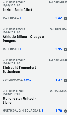 Schedina Europa League 17-04-25 Recensione Bonus Il nostro Voto Offerta SNAI € 5+500 4.8 Scopri Pronostici Europa League 2025-04-17 Scommetti 25 € VINCI 119.75 € PIAZZA LA SCOMMESSA Quota Totale 4.79 SNAI ti offre subito 5€ GRATIS senza deposito, più 10 GRATIS al Casinò e 550 € di rimborso scommesse Book Consigliati e Recensiti 1 15 € GRATIS + 1024 € 4.8 / 5 TOTAL SCORE Check >>> Check >>> 2 30 euro + 20 giocate gratis 3.9 / 5 TOTAL SCORE Check >>> Check >>> 3 5 € GRATIS + 300 4.6 / 5 TOTAL SCORE Check >>> Check >>> 4 100 € sulla prima scommessa 4.8 / 5 TOTAL SCORE Check >>> Check >>>