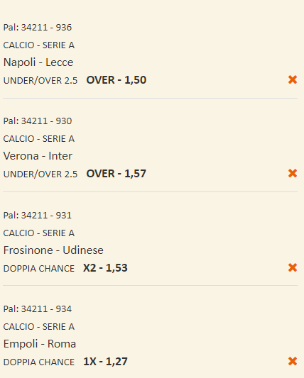 Schedina Serie A 26-05-24 Recensione Bonus Il nostro Voto Offerta SNAI € 5+500 4.8 Scopri Pronostici Serie a 2024-05-26 Scommetti 25 € VINCI 114.25 € PIAZZA LA SCOMMESSA Quota Totale 4.57 SNAI ti offre subito 5€ GRATIS senza deposito, più 10 GRATIS al Casinò e 550 € di rimborso scommesse Book Consigliati e Recensiti 1 15 € GRATIS + 1024 € 4.8 / 5 TOTAL SCORE Check >>> Check >>> 2 30 euro + 20 giocate gratis 3.9 / 5 TOTAL SCORE Check >>> Check >>> 3 5 € GRATIS + 300 4.6 / 5 TOTAL SCORE Check >>> Check >>> 4 100 € sulla prima scommessa 4.8 / 5 TOTAL SCORE Check >>> Check >>>