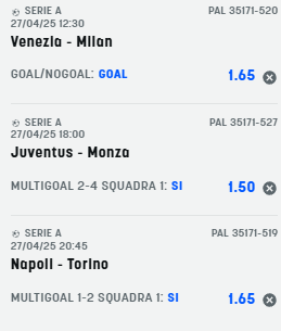 Schedina Serie A 27-04-25 Recensione Bonus Il nostro Voto Offerta SNAI € 5+500 4.8 Scopri Pronostici Serie a 2025-04-27 Scommetti 25 € VINCI 102 € PIAZZA LA SCOMMESSA Quota Totale 4.08 SNAI ti offre subito 5€ GRATIS senza deposito, più 10 GRATIS al Casinò e 550 € di rimborso scommesse Book Consigliati e Recensiti 1 15 € GRATIS + 1024 € 4.8 / 5 TOTAL SCORE Check >>> Check >>> 2 30 euro + 20 giocate gratis 3.9 / 5 TOTAL SCORE Check >>> Check >>> 3 5 € GRATIS + 300 4.6 / 5 TOTAL SCORE Check >>> Check >>> 4 100 € sulla prima scommessa 4.8 / 5 TOTAL SCORE Check >>> Check >>>
