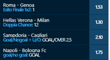 Schedina vincente 07-03-2021 Book Consigliati e Recensiti 1 15 € GRATIS + 1024 € 4.8 / 5 TOTAL SCORE Check >>> Check >>> 2 30 euro + 20 giocate gratis 3.9 / 5 TOTAL SCORE Check >>> Check >>> 3 5 € GRATIS + 300 4.6 / 5 TOTAL SCORE Check >>> Check >>> 4 100 € sulla prima scommessa 4.8 / 5 TOTAL SCORE Check >>> Check >>>