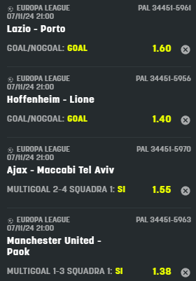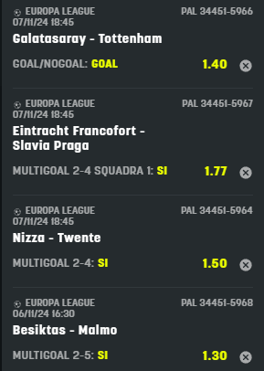 Schedine Europa League 07-11-24 Recensione Bonus Il nostro Voto Offerta SNAI € 5+500 4.8 Scopri Pronostici Europa League 2024-11-07 Scommetti 25 € VINCI 120.75 € PIAZZA LA SCOMMESSA Quota Totale 4.83 SNAI ti offre subito 5€ GRATIS senza deposito, più 10 GRATIS al Casinò e 550 € di rimborso scommesse Scommetti 25 € VINCI 119.75 € PIAZZA LA SCOMMESSA Quota Totale 4.79 SNAI ti offre subito 5€ GRATIS senza deposito, più 10 GRATIS al Casinò e 550 € di rimborso scommesse Book Consigliati e Recensiti 1 15 € GRATIS + 1024 € 4.8 / 5 TOTAL SCORE Check >>> Check >>> 2 30 euro + 20 giocate gratis 3.9 / 5 TOTAL SCORE Check >>> Check >>> 3 5 € GRATIS + 300 4.6 / 5 TOTAL SCORE Check >>> Check >>> 4 100 € sulla prima scommessa 4.8 / 5 TOTAL SCORE Check >>> Check >>>