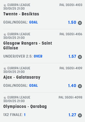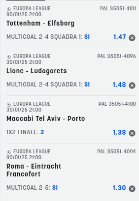 Schedine Europa League 30-01-25 Recensione Bonus Il nostro Voto Offerta SNAI € 5+500 4.8 Scopri Pronostici Europa League 2025-01-30 Scommetti 25 € VINCI 97.5 € PIAZZA LA SCOMMESSA Quota Totale 3.90 SNAI ti offre subito 5€ GRATIS senza deposito, più 10 GRATIS al Casinò e 550 € di rimborso scommesse Scommetti 25 € VINCI 104.5 € PIAZZA LA SCOMMESSA Quota Totale 4.18 SNAI ti offre subito 5€ GRATIS senza deposito, più 10 GRATIS al Casinò e 550 € di rimborso scommesse Book Consigliati e Recensiti 1 15 € GRATIS + 1024 € 4.8 / 5 TOTAL SCORE Check >>> Check >>> 2 30 euro + 20 giocate gratis 3.9 / 5 TOTAL SCORE Check >>> Check >>> 3 5 € GRATIS + 300 4.6 / 5 TOTAL SCORE Check >>> Check >>> 4 100 € sulla prima scommessa 4.8 / 5 TOTAL SCORE Check >>> Check >>>