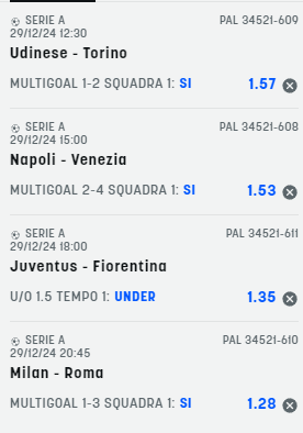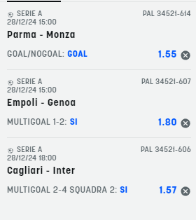 Schedine Serie A 28 e 29-12-24 Recensione Bonus Il nostro Voto Offerta SNAI € 5+500 4.8 Scopri Pronostici Serie a 2024-12-29 Scommetti 25 € VINCI 109.5 € PIAZZA LA SCOMMESSA Quota Totale 4.38 SNAI ti offre subito 5€ GRATIS senza deposito, più 10 GRATIS al Casinò e 550 € di rimborso scommesse Scommetti 25 € VINCI 103.75 € PIAZZA LA SCOMMESSA Quota Totale 4.15 SNAI ti offre subito 5€ GRATIS senza deposito, più 10 GRATIS al Casinò e 550 € di rimborso scommesse Book Consigliati e Recensiti 1 15 € GRATIS + 1024 € 4.8 / 5 TOTAL SCORE Check >>> Check >>> 2 30 euro + 20 giocate gratis 3.9 / 5 TOTAL SCORE Check >>> Check >>> 3 5 € GRATIS + 300 4.6 / 5 TOTAL SCORE Check >>> Check >>> 4 100 € sulla prima scommessa 4.8 / 5 TOTAL SCORE Check >>> Check >>>