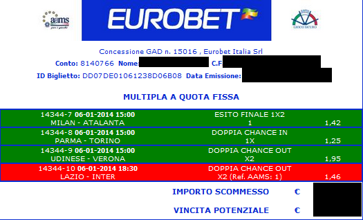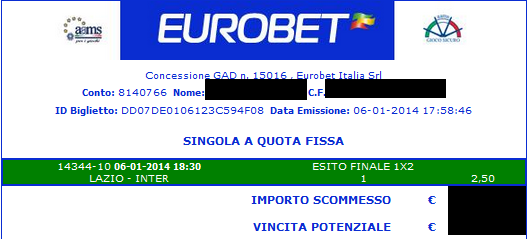 La prima bolla aveva quota 5, se avessimo puntato 25 € la vincita potenziale sarebbe stata 125 €. La vittoria della Lazio era quotata 2,50 puntandoci sopra 50 € la vincita sarebbe stata 125€.Quindi spendendo un totale di 75 € ci siamo assicurati una vincita di 50€ tondi tondi. Qualcuno prima della partita avrebbe potuto dire che facendo in questo modo la vincita si è ridotta del 50%, passando da 100 € netti a 50 €. Si è vero però con questo sistema ci siamo ASSICURATI e ripeto assicurati, una vincita SICURA, non correndo il rischio di incorrere in quello che poi è successo e cioè che l’Inter ha perso e quindi di non vincere un bel niente.