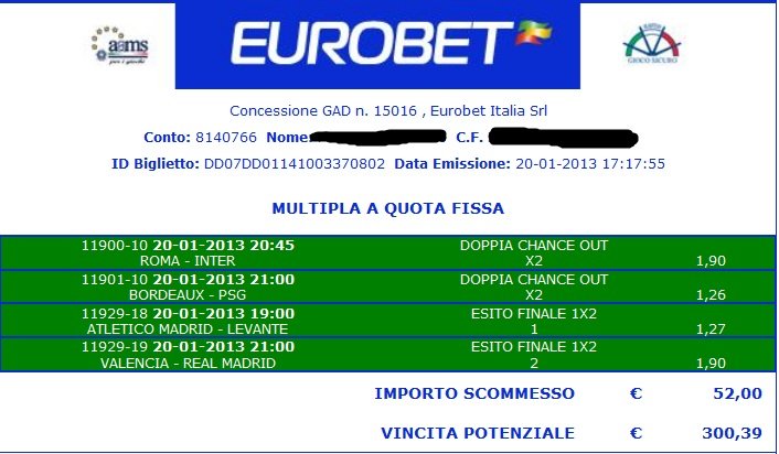 Mi scuso con i lettori del blog, sia quelli abituali, che stanno diventando sempre più numerosi, sia con chi è capitato per la prima volta su queste pagine nella giornata di ieri o stamattina, perchè ahimè il sito non è stato raggiungibile……Questo non per colpa mia, ma per colpa del server ballerino che ospita queste pagine.Mi sono ripromesso infatti, di cambiare hosting, anche se questo comporterà qualche disagio.Comunque vi pubblico la ricevuta di una scommessa vincente, giocata con dei pronostici che come al solito pubblico nella giornata di Domenica, ma per i motivi che vi ho appena citato non ho potuto postare.Sperando che questo piccolo grande disguido non abbia incrinato il rapporto che si stava creando via auguro come al solito Buon Betting