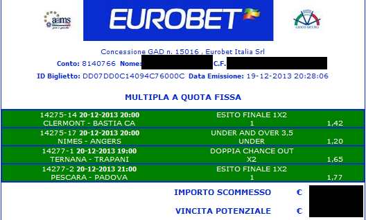 Dopo qualche giorno senza vincite, siamo ritornati a fare cassa. Come al solito vi pubblico la ricevuta della scommessa vincente e spero che qualcuno di voi l’abbia giocata e fatto cassa