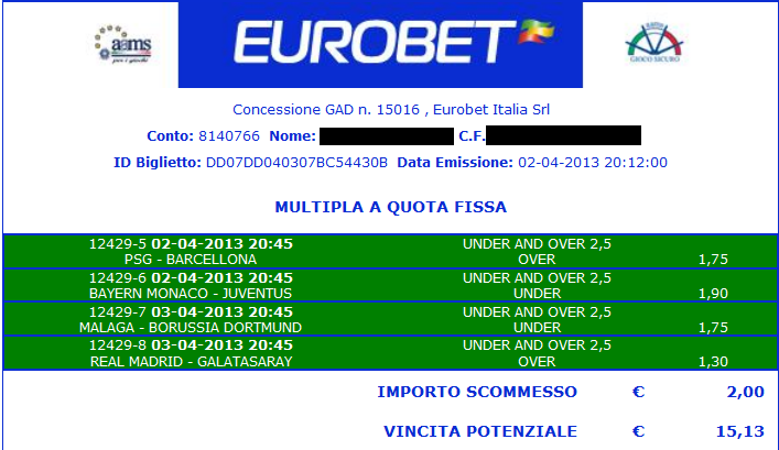 Vi pubblico la ricevuta della scommessa vincente giocata con i pronostici del 03 aprile , sperando che qualcuno di voi l’abbia giocata e fatto un pò di cassa. L’importo che io scommetto sulle bolle che vi propongo è solo indicativo, serve per tenere traccia delle vincite e per confermare la bontà dei pronostici fatti. Ognuno di voi, può giudicare la bontà delle schedine proposte di volta in volta e giocare quanto più gli piace secondo le proprie possibilità, ovviamente senza esagerare e ricordando che è solo un gioco.