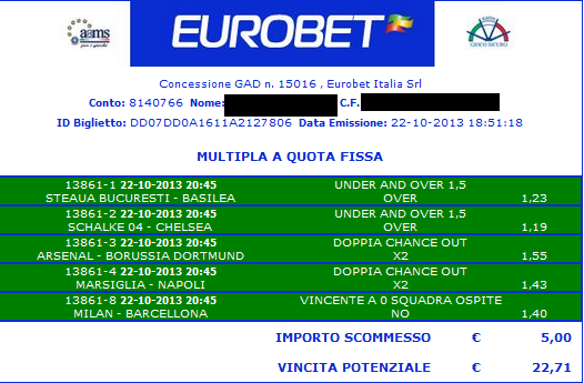 Vi pubblico la ricevuta della scommessa vincente sulla Champions league giocata con i pronostici del 22-10-2013