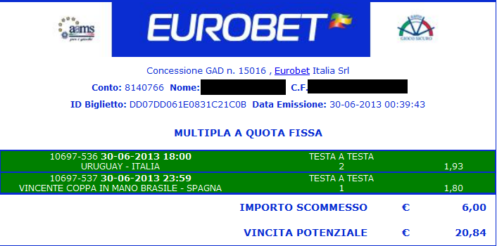 Vi pubblico le ricevuta della scommessa vincente giocata con i pronostici di Domenica 30 Giugno 2013.