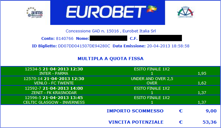 Vi pubblico le ricevuta della scommessa vincente giocata con i pronostici del 21 aprile .
