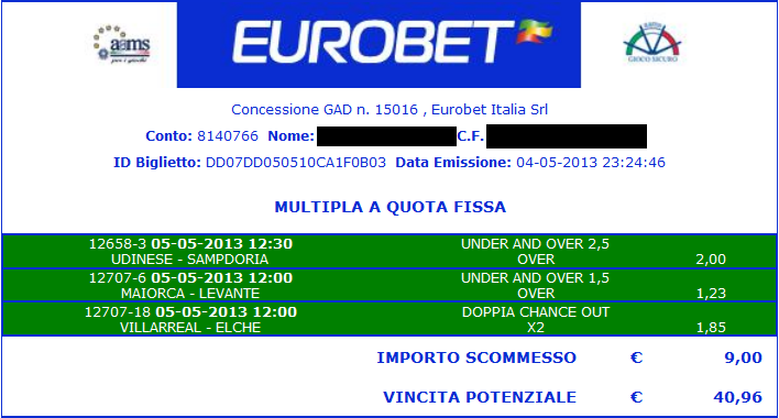 Vi pubblico le ricevuta della scommessa vincente giocata con i pronostici di Domenica 05 Maggio 2013 .