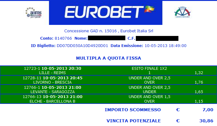 Vi pubblico le ricevuta della scommessa vincente giocata con i pronostici di Venerdì 10 Maggio 2013 .