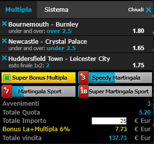Scommesse vincenti 06-04-19 Book Consigliati e Recensiti 1 15 € GRATIS + 1024 € 4.8 / 5 TOTAL SCORE Check >>> Check >>> 2 30 euro + 20 giocate gratis 3.9 / 5 TOTAL SCORE Check >>> Check >>> 3 5 € GRATIS + 300 4.6 / 5 TOTAL SCORE Check >>> Check >>> 4 100 € sulla prima scommessa 4.8 / 5 TOTAL SCORE Check >>> Check >>>