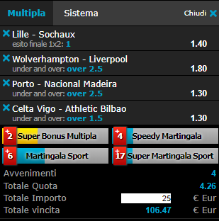 Scommesse vincenti 07-01-19 Book Consigliati e Recensiti 1 15 € GRATIS + 1024 € 4.8 / 5 TOTAL SCORE Check >>> Check >>> 2 30 euro + 20 giocate gratis 3.9 / 5 TOTAL SCORE Check >>> Check >>> 3 5 € GRATIS + 300 4.6 / 5 TOTAL SCORE Check >>> Check >>> 4 100 € sulla prima scommessa 4.8 / 5 TOTAL SCORE Check >>> Check >>>