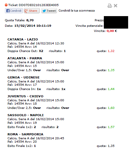 Scommesse Vincenti 15 e 16 Febbraio 2014