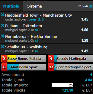 Scommesse vincenti 20-01-19 Book Consigliati e Recensiti 1 15 € GRATIS + 1024 € 4.8 / 5 TOTAL SCORE Check >>> Check >>> 2 30 euro + 20 giocate gratis 3.9 / 5 TOTAL SCORE Check >>> Check >>> 3 5 € GRATIS + 300 4.6 / 5 TOTAL SCORE Check >>> Check >>> 4 100 € sulla prima scommessa 4.8 / 5 TOTAL SCORE Check >>> Check >>>